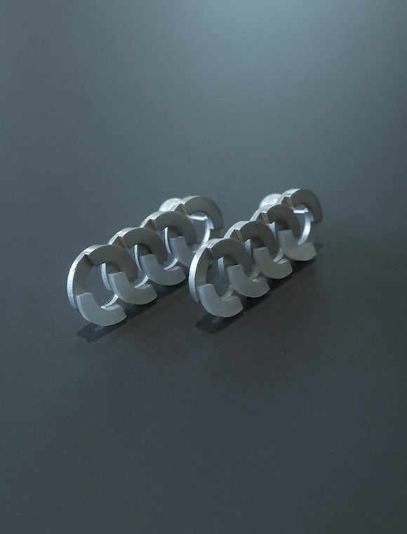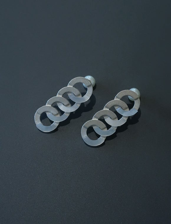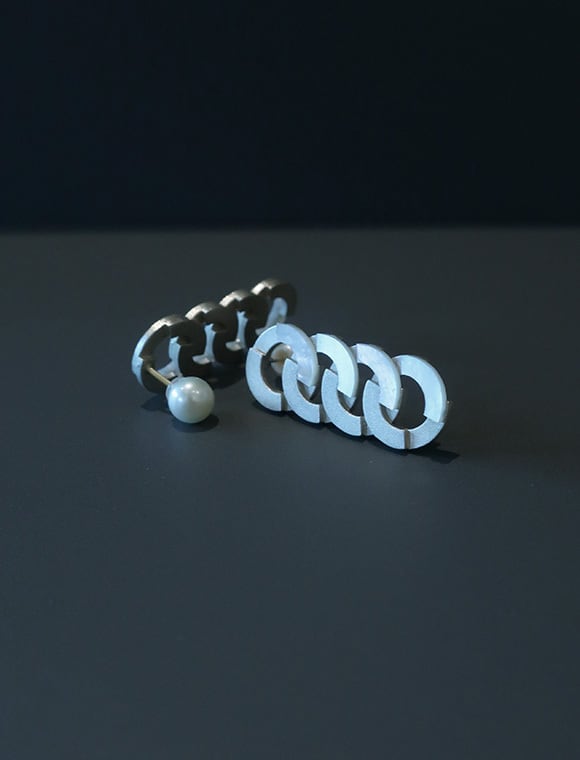 キヘイチェーンを円形で再解釈し構成した[Kihei]シリーズ。本来であれば輪っかを繋ぎ、捻り、擦り上げることで完成するキヘイチェーン。最小限のフォルムはそのままに、フラットな板でその構造を再現しました。一部パーツを白蝶貝に、キャッチをパールにすることでジオメトリックな印象を優しくしています。キャッチを前にして、裏側にチェーンが見えるように着けても素敵です。