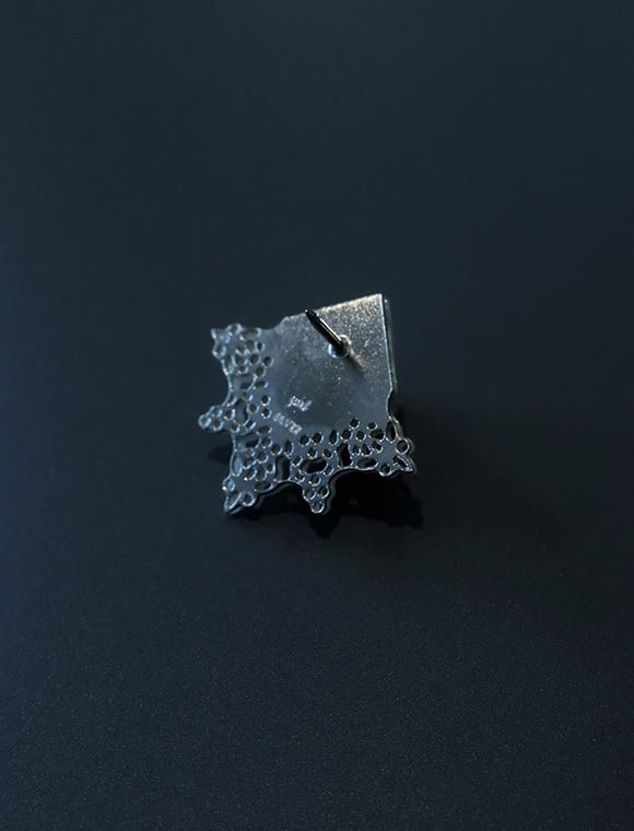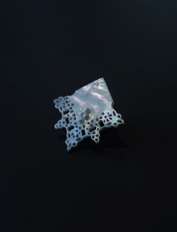 刺繍のレースデザインも、よく見ると図形の繰り返し。レースをモチーフにした、というより、デザイナーが模様を繰り返して並べているとレースになった、というのが実のところ。こちらは折り畳まれたレースのハンカチのようなイメージ。白蝶貝の繊細な透かしと、ケシパールが上品にマッチします。裏面にも同形のシルバーの板が貼ってあるので、繊細かつ丈夫な作りとなっています。