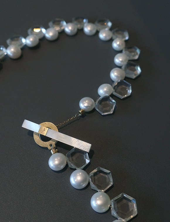 ビーズの穴位置を中心からずらして空けることで、通すと互い違いにパーツが配置される[cleopatra]のシリーズ。クリアな六角形のロッククリスタルとボタンパールの遊色が、女性らしくもキリッとした印象のネックレスです。エンドパーツ部分は白蝶貝とK18で作られたオリジナル仕様。前に来ても可愛いデザインとなっています。