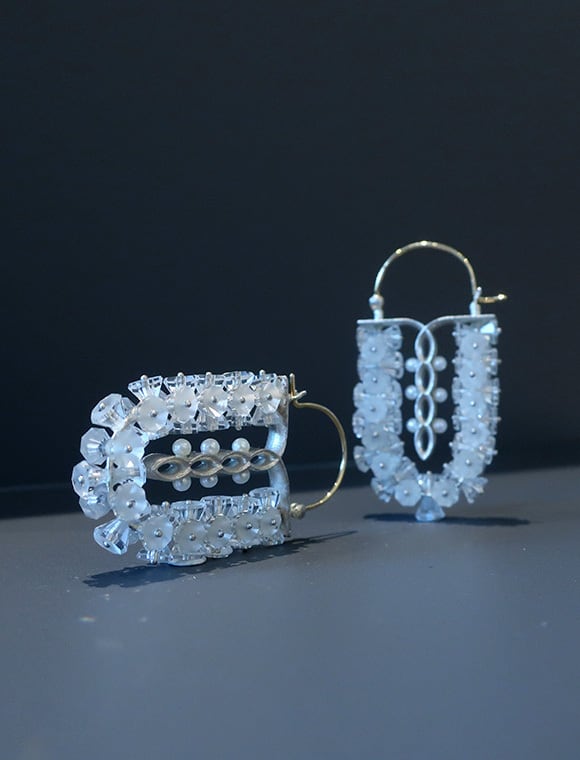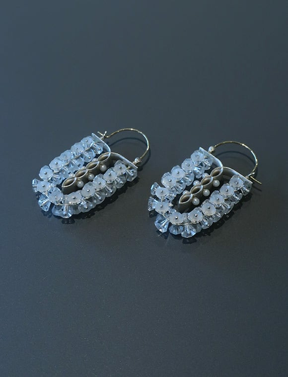ダイヤのカットに似たビンテージのロッククリスタルは、昭和50~70年代に流行した山梨の伝統的なカットデザイン。テーブルは1つずつリカットし曇らせてあるので、フロスト部分とクリア部分が共存してキラキラしすぎず落ち着いた印象。1ペアのピアスで水晶のパーツは100ピース以上。ボリューミーで、存在感のあるピアスは、ワンピースにさらりと合わせるだけでオケージョンコーディネートが決まる一品です。