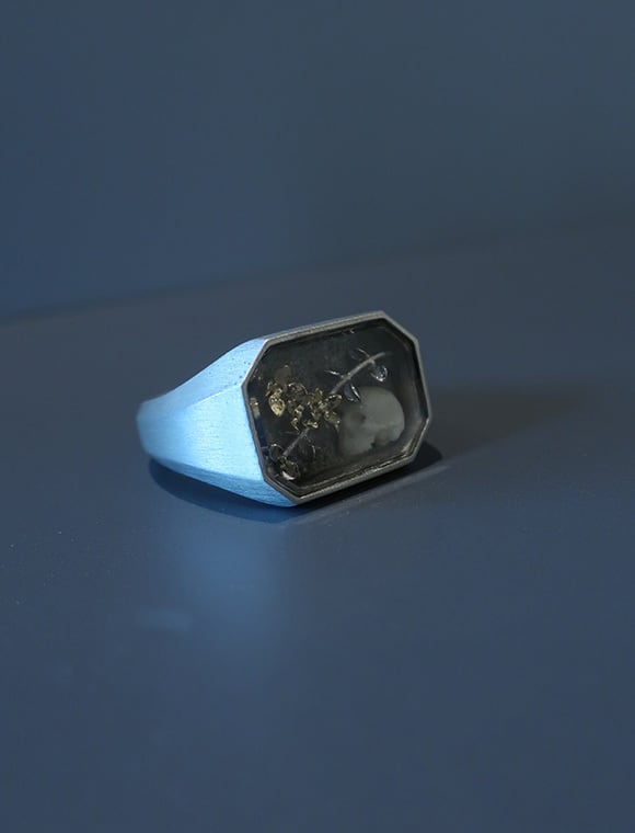 生死の象徴であるスカルと、儚くも可憐な花。共存する2つのモチーフと、背景の無機質なコンクリートから、脆さの中にある美しさを感じさせます。スカルのサイズは直径4mmほど。緻密で精巧な作りとなっています。腕時計に使用されるオクタゴンカットのサファイアガラスで蓋をされたリングは、その一瞬を閉じ込めた標本箱のような佇まい。スカルは鹿角、花はK18、Pt900でのお作りです。