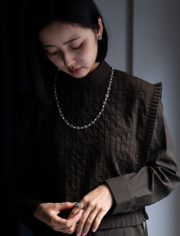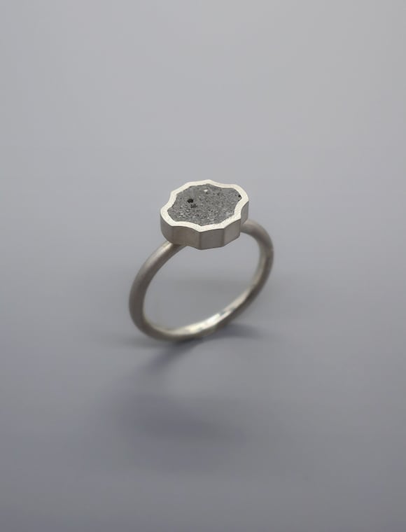 クラシカルなフォルムにフレーミングされたコンクリートパーツが印象的なリング。コンクリートの表情や色合いはインダストリアル感が強く無機質な印象ですが、優しいフレームの形とマッチし、クールさと上品さがバランス良く共存します。よく見るとへこみやほころび等、素材の中にある繊細な表情に気付かされます。一つひとつが違い、天然石のように選ぶ楽しみがあります。