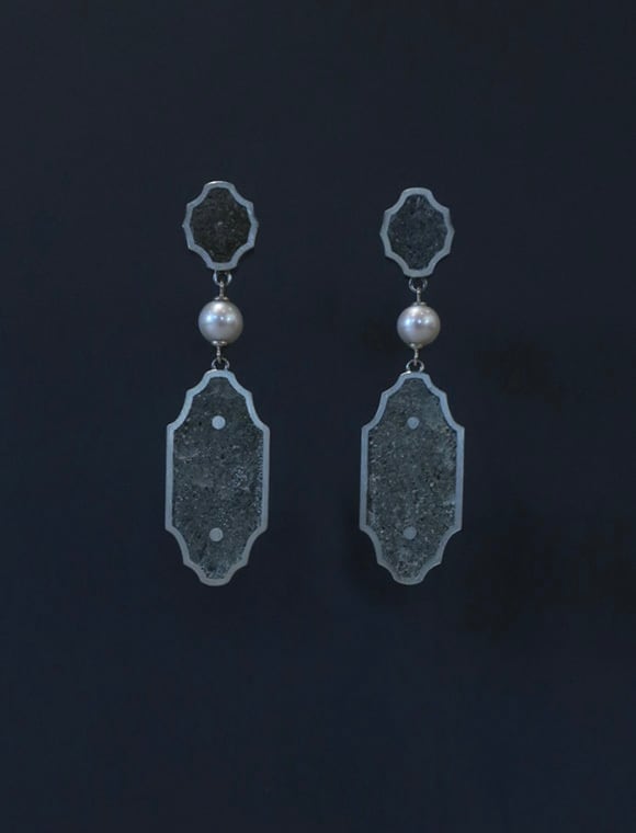 クラシカルなフォルムにフレーミングされたコンクリートパーツがパールと構成された印象的なピアス。コンクリートのもつ無機質な表情や色合いはインダストリアル感が強い印象ですが、優しい遊色の真珠が意外なほどマッチし、クールさと上品さがバランス良く共存します。ボリューム感も揺れる動きもあるので、オケージョンシーンに個性をプラスしてくれます。コンクリートのへこみやほころび等、素材の中にある繊細な表情が魅力的なピアスです。