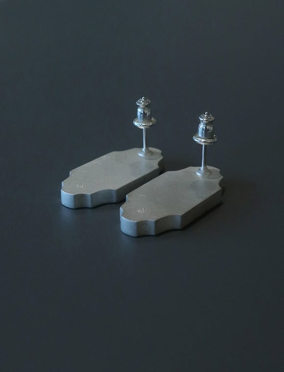 クラシカルなフォルムにフレーミングされたコンクリートパーツと二つのドットが印象的なピアス。コンクリートのもつ無機質な表情や色合いはインダストリアル感が強い印象ですが、優しいフレームの形とマッチし、クールさと上品さがバランス良く共存します。ボリューム感も揺れる動きもあるので、オケージョンシーンに個性をプラスするのにも◎。コンクリートのへこみやほころび等、素材の中にある繊細な表情が魅力的なピアスです。