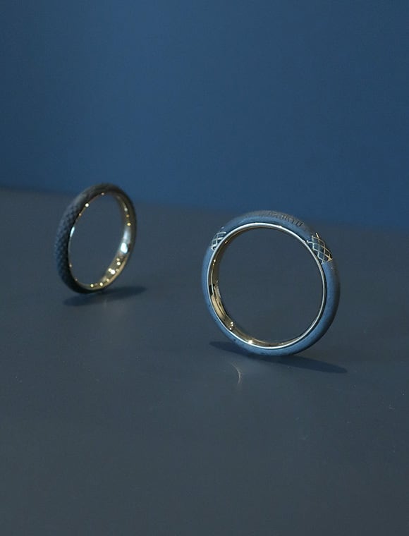※鉄部分は着用していると体質によって一度錆びることもありますが、着けるごとに他金属とは微妙に異なる美しいグレーへと色が落ち着いてきます。外しておく際には指輪を良く拭いて鉄部分に極薄くオイル等を塗布しておくとサビが進行しづらくなります。