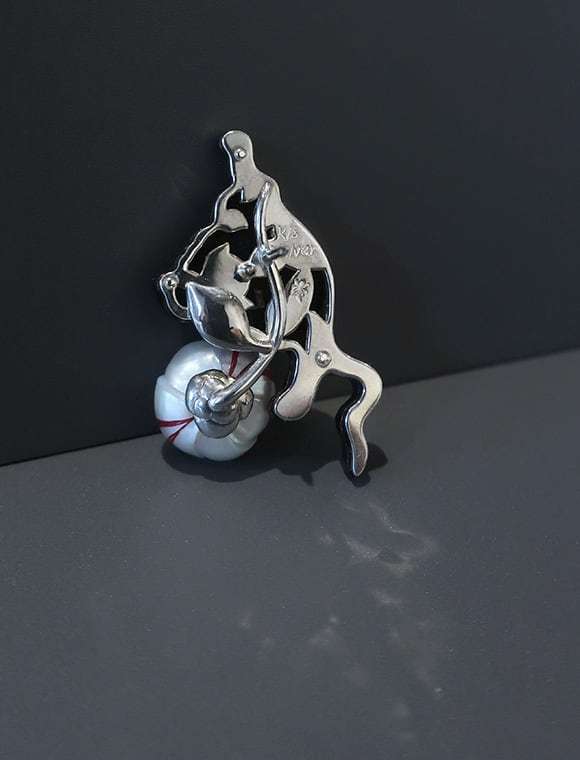 刀装具として知られる目貫。骨董品の獅子の目貫にパールを彫刻した牡丹をあつらえてブローチにしました。[獅子に牡丹]は、昔より取り合わせの良い吉祥の図柄として知られています。当時の職人への敬愛を込めた、コラボレーションジュエリーです。