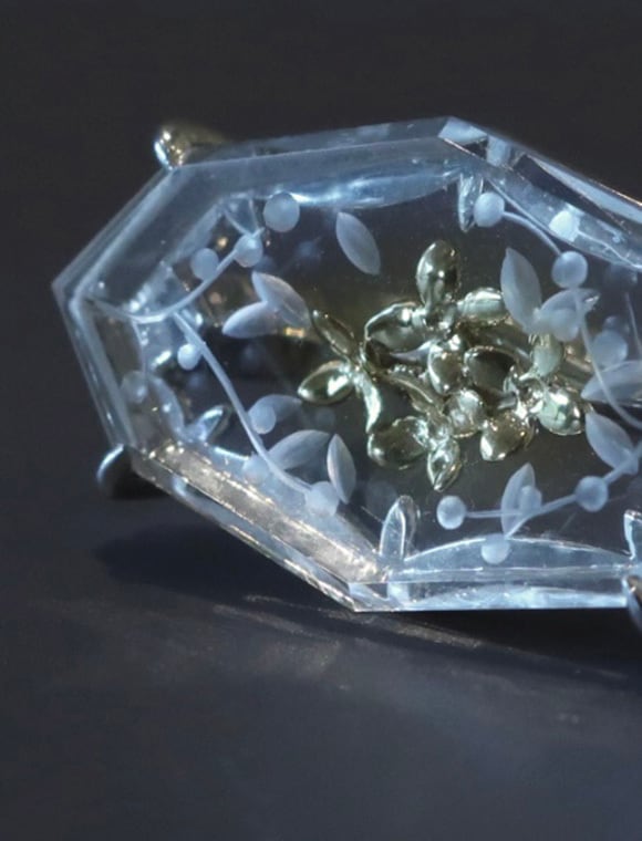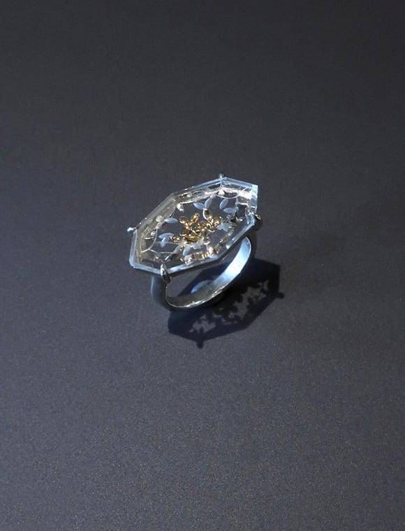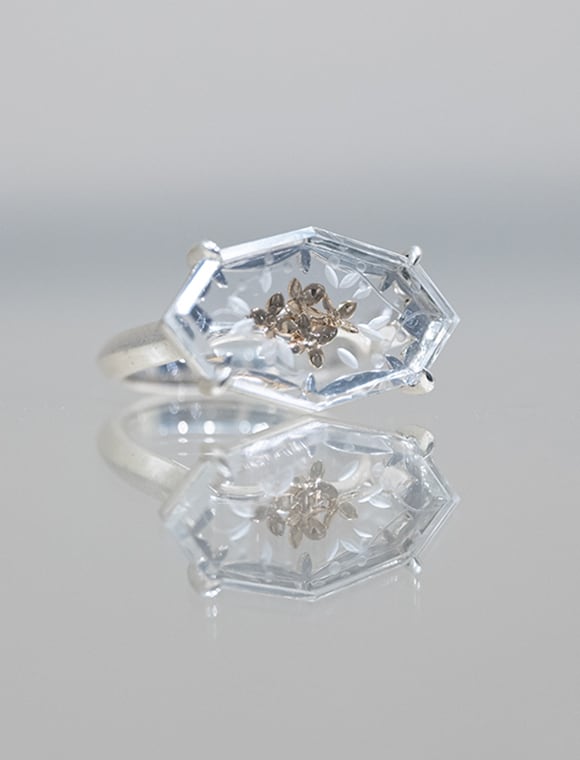 神崎 晃洋と田坂 留美、夫婦二人の[collaboration/fragile]シリーズ。ジュエリーの企画からデザイン、宝石研磨や制作などの全ての工程を二人であつらえた、贅沢なリミテッドジュエリーです。オリジナルカットのロッククリスタルに緻密なレイヤードカービングを施し、その奥にはK18の小さな花々が。幾重にも重なった奥行きのある世界をじっくり眺めたくなるリングです。