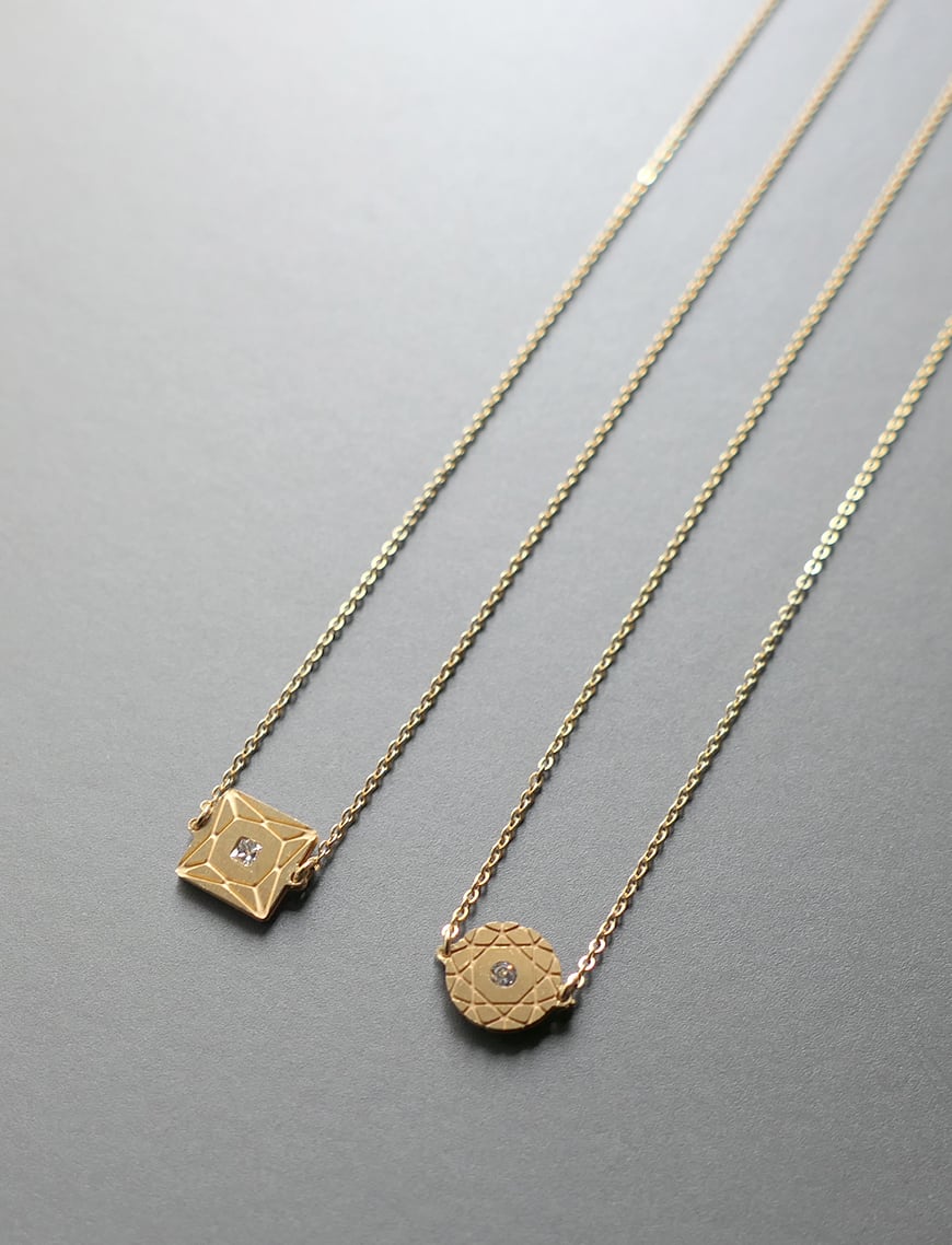 ソリテール(solitaire)とは、フランス語で「単独」を意味する一粒石のリングの総称です。さりげなくきらりと輝く中央の石がポイントのネックレスは、スクエアカットのキュービックジルコニアを、カットデザインが彫刻された2枚の板で挟み込んで留めています。少し短めでシンプルなデザインはお手持ちのネックレスとの重ね着けにも最適です。