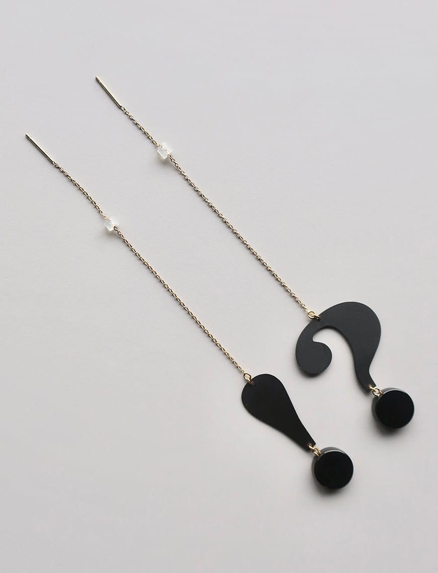 感嘆符をモチーフにしたビッグサイズのピアスは、耳元を見た人が「!?」となるようなユニークなデザイン。キャッチの位置を変えることで、長くも短くも着けていただけます。
